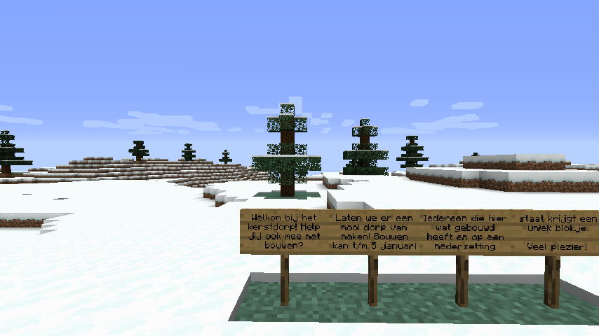 Het spawnpunt is tijdelijk verplaatst naar een ijzige vlakte ver weg, ingesloten tussen bergen en een rivier. We gaan hier een winters dorp bouwen. Iedereen mag meehelpen! Als je meedoet (je hebt wat gebouwd) dan krijg je na de kerstvakantie een uniek blokje.